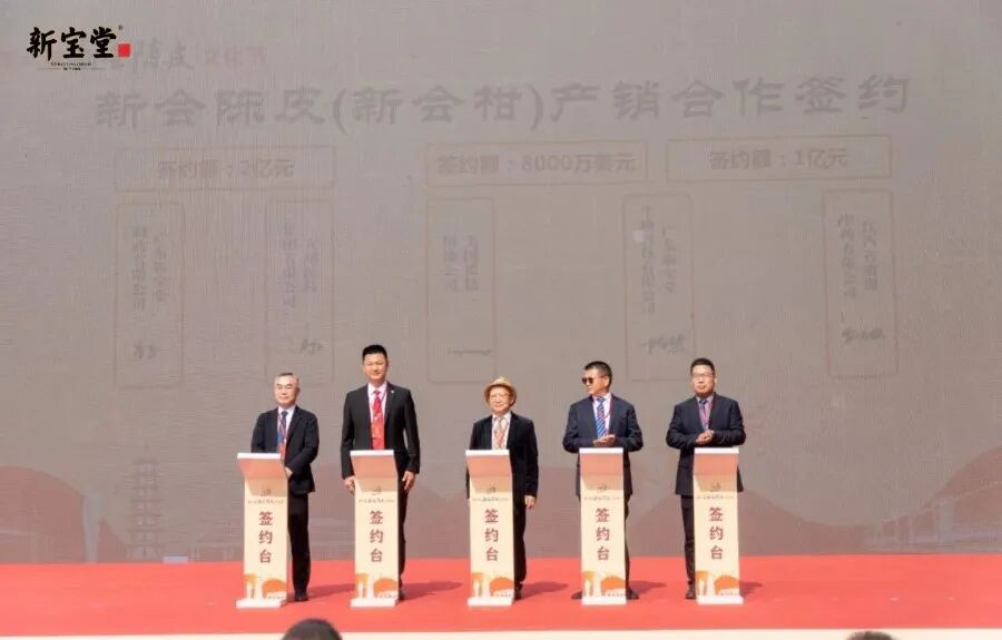 广东新宝堂制药有限公司与大翔医药集团有限公司针对“新会陈皮中药材采购”合作举行签约仪式,该项目金额高达2亿元人民币。